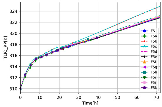 At the beginning of the studied scenario, the water level in the RCS dropped rapidly from 0.0 s due to one ventilation valve located at the top of the PRZ being stuck open. The coolant level in the core decreased to around 8 m (base case and F5), where the coolant drop slowed down (Figure 3). Three different groups of results could be noticed among sensitivity cases: lower water level (F5b and F5c, increased decay heat), high level (F5a, reduced heat transfer), and medium (rest of the cases). Increased decay heat (F5b, F5c) accelerates coolant evacuation from the RPV and led to the lowest RCS coolant level. Applying material with reduced THCs (F5a) decreased the system’s capability to evacuate energy from the core to the ultimate heat sink. The F5a case, in the first few hours of the transient state, had the highest RCS pressures (Figure 4 and Figure 5) and the lowest reactor pool temperatures (Figure 6).