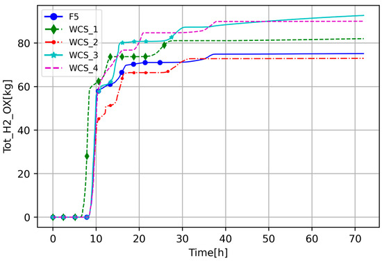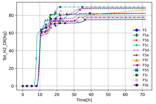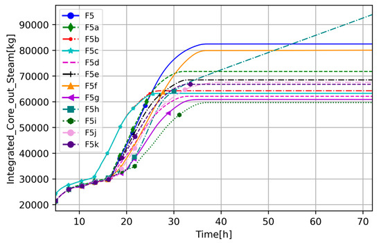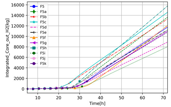 To understand transient progression and differences between the cases, the RCS circulation integrated steam and H2 mass flow is presented (Figure 11 and Figure 12). It should be noted that these figures show cumulative flow, meaning that, if it is constant, there is no flow. In Figure 11, at around 13 h the flow is higher in F5b and F5c (high decay heat) than in the other cases, which is caused by high steaming due to the core being uncovered, and it stops at around 25 h, meaning there is no more steam flow through the core. This also occurs for the other cases, but with a slight delay; extensive streaming starts at around 17 h and, depending on the cases, it stops between 30 and 35 h, which corresponds with Figure 10. While the timing when steam stops flowing is similar between the cases, the amount of steam that flew through the core is significantly different. The highest, the F5 and F5f cases, suggest that default parameters and decreased heat transfer from the core to the bypass enhance convective forces and slow the oxidation process compared to other sensitivity cases. Another outliner is the F5h case, which, as mentioned before, is the only one which did not consume steam in the oxidation; thus, integrated mass flow through the core is the highest.