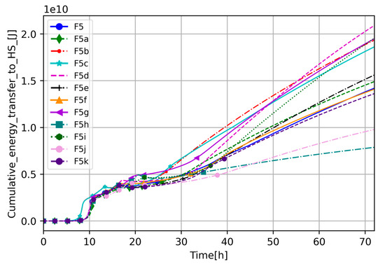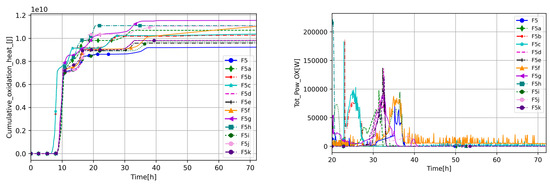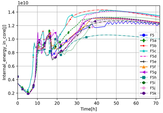 To better understand the dynamics of the investigated scenario and the impact of the selected parameters, the total cumulative energy transfer to core barrel HSs and upper core plate HSs (Figure 16) and the total internal energy in the COR package (Figure 17) were analyzed. In Figure 16, one can see that for the most crucial core degradation phase (6–20 h), the increased decay heat caused higher energy transfer to the HS at the beginning of the phase (6–10 h). The period between 10 and 20 h was full of variation between cases but in the same range, and any significant difference cannot be distinguished. However, in the scenario’s late phase, few cases provide interesting results. Besides differences linked to increased decay heat, the F5d, F5g, and F5i cases transfer more energy to the HS than the others (see Figure 16), which is a consequence of the aforementioned higher average temperature in the core and, in the case of F5d, modification of heat transfer paths. The lowest energy transfer to the HS is calculated by high debris porosity case and high molten material holdup, most probably because, in those cases, energy is transferred more efficiently to the coolant than to the HS.