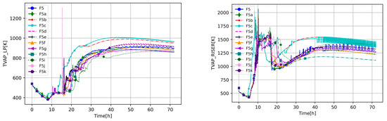 The final two cases, F5j and F5k, are focused on the maximum temperature of the zirconium dioxide shell before the breakthrough occurs. This is the MELCOR sensitivity coefficient (SC-1131(2)) and was shown to be important by various researchers [24,26,28,29,30]. This parameter defines the temperature at which a break will occur, and molten unoxidized materials can be exposed to the coolant system environment. Two extreme values are considered: 2100.0 K and 2550.0 K, based on [28,29].