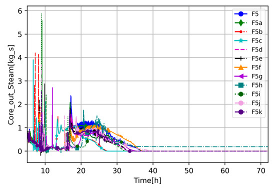 Figure 10 shows that steam mass flow-rate circulation in the RCS, in most cases, decreased to zero or close to zero, which is associated with oxidation; see Figure 8. This correlation indicates that the reason for reduced steam flow is that all steam in the RPV was consumed by an oxidation reaction or escaped to the containment vessel. Only the F5h case keeps a constant steam mass flow rate due to higher debris porosity and better cooling; core temperature decreased below the oxidation threshold before the whole steam was consumed.