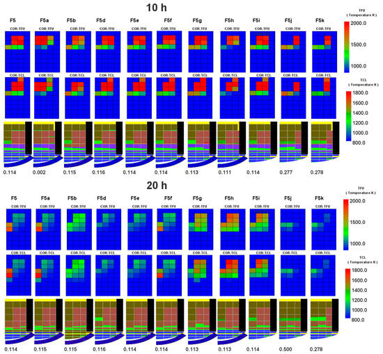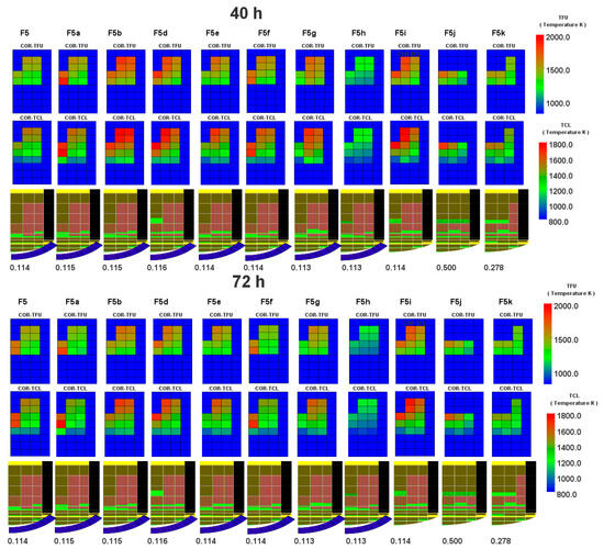 By analyzing oxidation heat (Figure 8) together with material and temperature distribution (see Figure 13 and Figure 14) (case F5c is not shown due to similarity to F5b), one can see that temperature along the core decreases with time and the highest temperature at the end of the simulation is related to the cells where core debris is collecting. Figure 13 and Figure 14 present temperature and non-zero cells, indicating which components remained uncollapsed—fuel (TFU) and cladding (TCL). The F5j and F5k cases with a modified maximum ZrO2 holdup temperature seem to affect the results the most as the core degradation is the highest in these cases. Another observation is that the F5g and F5i cases (low debris porosity and core melt breakthrough candling increased) keep a relatively high temperature in the core compared to the rest, which cools down with time. Also, there is a visible impact of high porosity (F5h), which most effectively cools down the core as a consequence of steam circulation for the whole of the transient state.