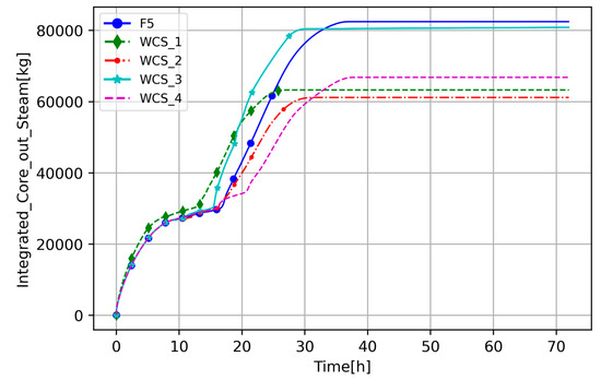 The WCS integrated steam mass flow through the core comparison to the base case, F5.