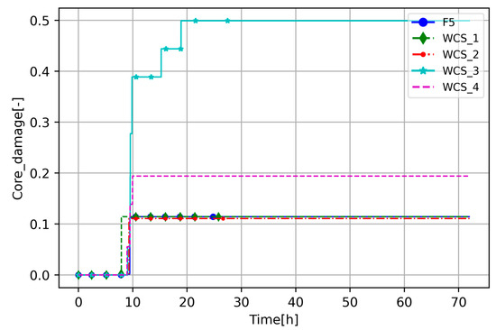 The WCS fraction of core degradation (collapse variable COR-DAMAGE) comparison to the base case, F5.