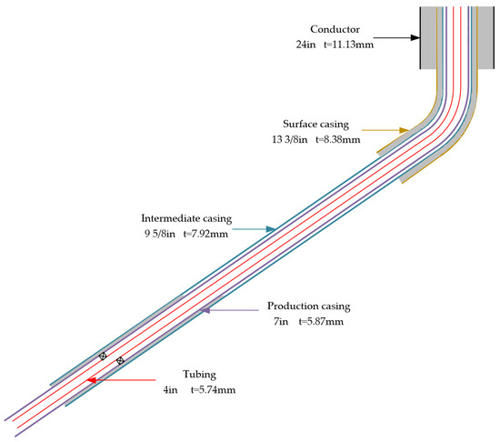 The maximum bottom displacement of the CO2 injection well in the X gas field is 2704.37 m. The CO2 storage is planned for 100 years. The planar wave range is 1700 m, which is about 800 m away from the water source well. This CO2 injection well has a large displacement and slope. The well’s parameters are shown in Table 1. The CO2 injection well consists of a straight section and an inclined section. The measured depths of the straight section and inclined section are 775.88 m and 3262.06 m, respectively. The inclined section has an inclination angle of 56 degrees. The true vertical depth of the CO2 injection zone ranges from 2400 m to 2600 m.