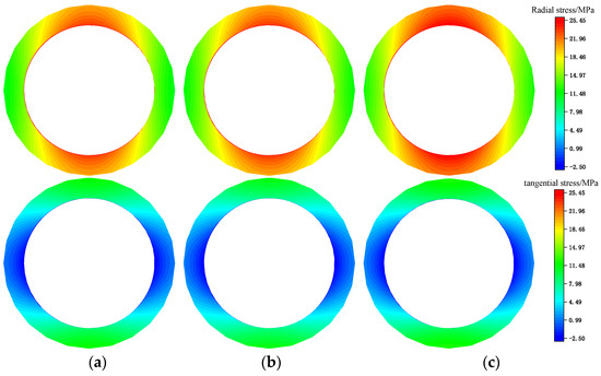 Radial and tangential stress distributions of cement sheath at different vertical depths: (a) 2400 m; (b) 2500 m; and (c) 2600 m.