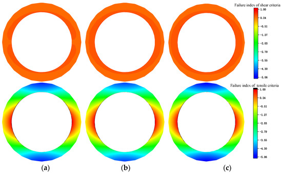 The shear damage criterion used in this paper was the Mohr–Coulomb theory, and the shear damage criterion was evaluated as shown in Equation (14).