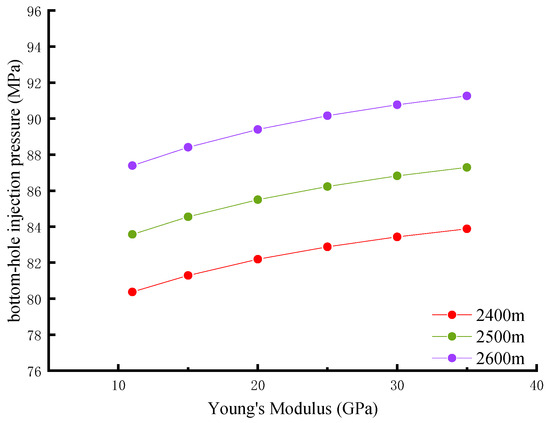Sensitivity analyses were conducted for sandstone at depths of 2400 m, 2500 m, and 2600 m, respectively, so as to evaluate the effect of the Young’s modulus of the cement sheath on the critical bottom-hole injection pressure. Figure 5 shows that the Young’s modulus has a positive effect on the critical bottom-hole injection pressure. For sandstone at a depth of 2600 m, the critical bottom-hole injection pressure increased from 87.39 MPa to 91.26 MPa when the Young’s modulus of the cement sheath increased from 11 GPa to 35 GPa, which is a 4.43% increase in the critical bottom-hole injection pressure. For other depths, the pattern of change between the critical bottom-hole injection pressure and the Young’s modulus of the cement sheath is basically the same as that of sandstone at a depth of 2600 m.