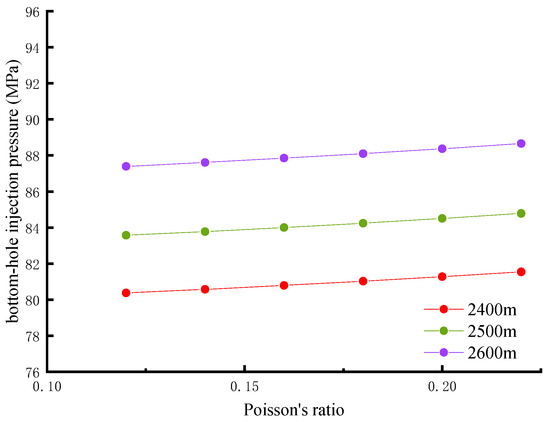 Similarly, for the sandstone at 2600 m, the critical bottom-hole injection pressure increased from 87.39 MPa to 88.66 MPa when Poisson’s ratio for the cement sheath increased from 0.12 to 0.22, and the critical bottom-hole injection pressure increased by 1.45%. For other depths, the pattern of change between the critical bottom-hole injection pressure and Poisson’s ratio for the cement sheath is basically the same as that of sandstone at a depth of 2600 m.