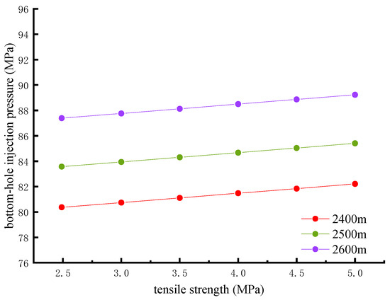 If the inclined well is replaced by a straight well, the critical injection pressures at 2400 m, 2500 m, and 2600 m could be 67.66 MPa, 68.80 MPa, and 72.62 MPa, respectively. Tensile failure also occurs. It can be seen that the critical bottom-hole injection pressure of the vertical well is about 14 MPa lower on average than that of the inclined well. This may be because when calculating the inclined well, the far-field principal stress, in the y-direction is larger than that of in the x-direction; therefore, the calculated circumferential stress is smaller, and the critical bottom-hole injection pressure of the inclined well is larger.