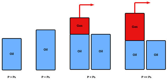 When a reservoir is undersaturated, the contained fluid remains in a single phase (oil or gas); hence, there is no dissolution change along with pressure. However, when the pressure is locally or globally allowed to decline below the saturation one, gas is released from the reservoir oil, or condensate forms when a gas reservoir is considered [7]. As a result, the remaining oil or gas composition and properties do vary over time as the pressure changes. Oil becomes heavier, more viscous and contains less dissolved gas, whereas gas becomes thinner. On the other hand, the liberated gas composition and properties keep changing along with pressure as different compounds get released at each pressure step due to the variance in their volatility [8].