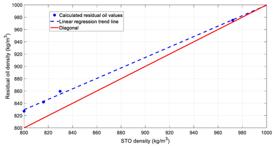 The total mass balance quality control (QC) is conducted using Equation (17) and the resulting residual oil densities are shown in Table 3, alongside the measured stock tank oil (STO) densities. All density values are in SI units. As mentioned in Section 3.1, the residual densities are anticipated to be higher than those of the stock tank oil and those differences are expected to be more pronounced in fluids with higher volatility.