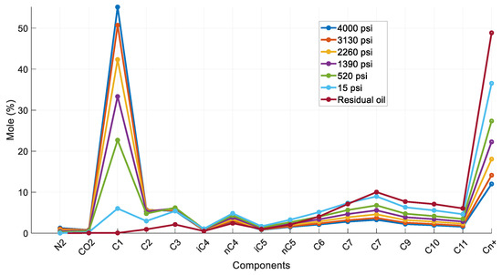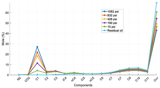 Once the oil compositions have been determined, they are plotted on a diagram for each pressure step and for each component. The changes in composition for each pressure value are observed, and any deviations from the expected behavior are analyzed. Under normal circumstances, with decreasing pressure, gas components should show decreasing concentrations, while the heavier oil components should exhibit increasing concentrations. When the pressure reaches the atmospheric level, the concentration of methane and other light components should be very close to zero. Moreover, the residual liquid composition can also be compared to the composition of the flashed liquid, readily accessible in the PVT report. As elucidated in Section 3.1, it is anticipated that the residual oil extracted from the DL study will exhibit a heavier composition compared to its flashed counterpart.