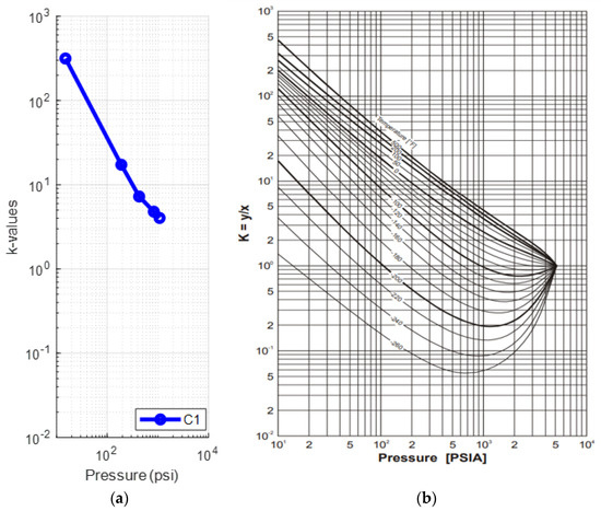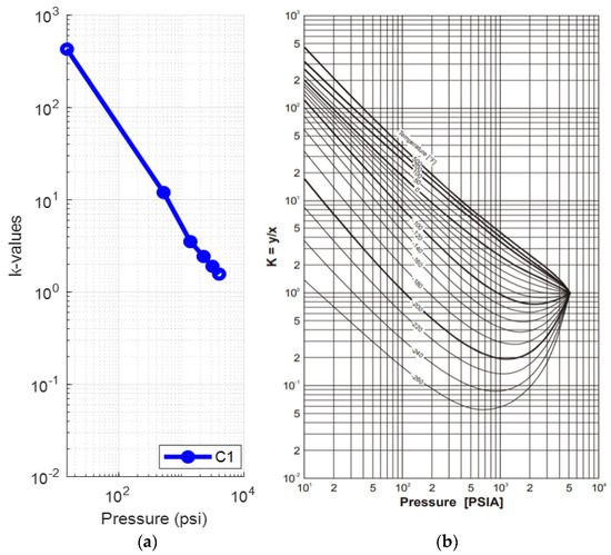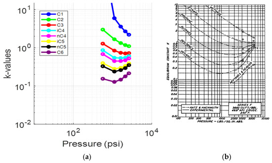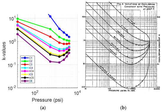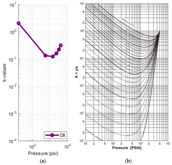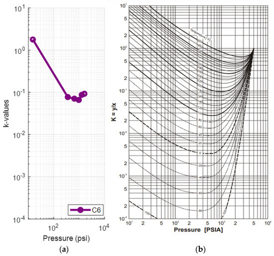 (a) k-values vs. pressure plot of the saturated oil’s methane at each DL step at 171.4 °F (reservoir fluid 4); (b) hexane k-value vs. pressure plot at different temperatures [59].
