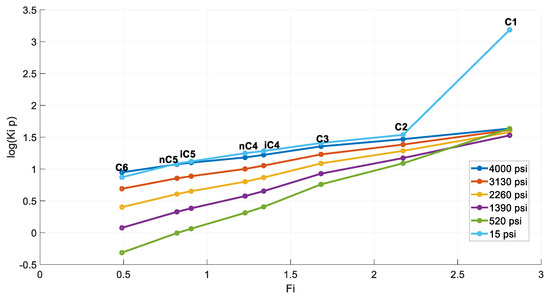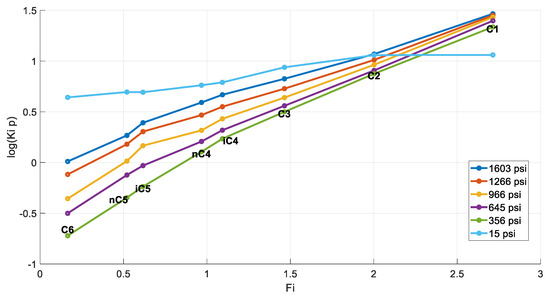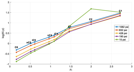 According to Hoffman et al. [56,58], when it comes to hydrocarbon components ranging from C1 to C6, the plot of exhibits a linear trend at all pressures. In addition, lighter components of the C1 to C6 range exhibit higher values due to their higher concentrations in the liberated gas phase. These plots need to be generated independently for each sample and for each pressure step of the DL study, comparing the values of the of hydrocarbon components C1–C6 with the constant values of the same components. As previously mentioned, the plot of is expected to exhibit a linear trend at all pressure steps, with the values decreasing for heavier components [56,58].