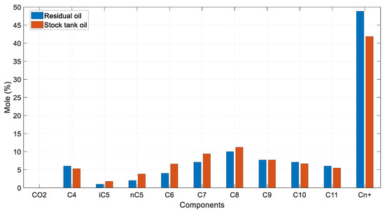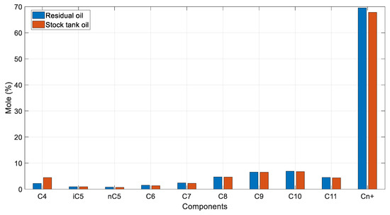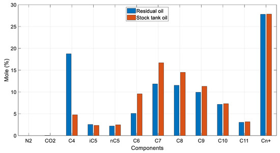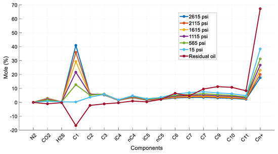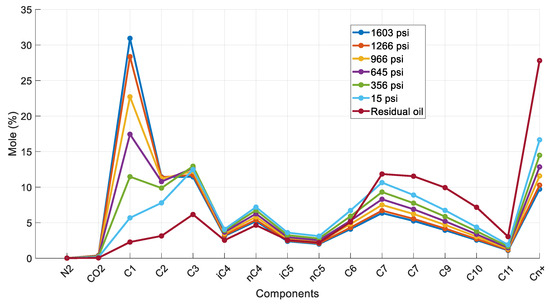 The molecular weight of the oil sample at each pressure step can be computed by multiplying the sum of its oil component’s concentrations and of the sum of their individual molecular weights. The molecular weight of the oil sample in the next pressure step (), however, cannot be computed in the same way; therefore, it should be computed with Equation (24).