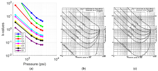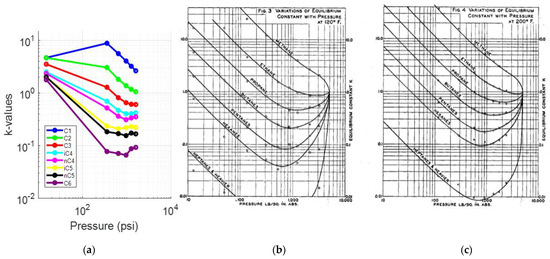 (a) k-values vs. pressure plot of the saturated oil at each DL test step (reservoir fluid 4); (b) typical oil k-value vs. pressure plot at 120 °F [59]; (c) typical oil k-value vs. pressure plot at 200 °F [59].