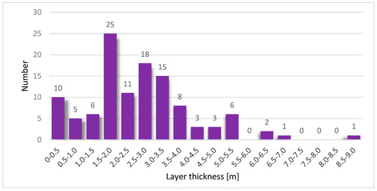 Figure 2. The thickness of mining waste layers in the embankment body for 438 geotechnical sections in the province. Lesser Poland [15].