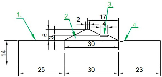 Figure 5. Assumed shaft geometry variant 2: 1. subsoil, 2. embankment body, 3. road base, 4. drainage ditch.