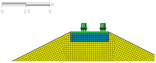 The article presents the results of numerical modelling in a program based on the Finite Element Method, MIDAS GTS NX. Numerical calculations were made for the stability of the body of flood embankments serving as road embankments for roads with light and medium traffic. The stability assessment in the MIDAS GTS NX program is based on the limit equilibrium method, according to the procedure for reducing strength parameters. The Shear Strength Reduce Method (SSRM) is used to determine the FoS stability coefficient. To calculate the stability of the designed flood embankment, the elastic–plastic Coulomb–Mohr soil model was used, and the soil parameters were introduced in accordance with the standard [26] and the D3 calculation approach: A2 + M2 + R3. It was assumed that the obtained test parameters are characteristic values (Xk), and the design parameters (Xd) were obtained as a result of applying appropriate partial coefficients in accordance with the Eurcode 7 standard. The shaft geometry and layer arrangement are shown in the drawing (Figure 4) and in the extended version (Figure 5). The slope of the water and air slopes was assumed to be at the ratio of 1:2. The height of the embankment crown was 6 m, the width of the embankment body at the base was 28 m. A 4 m wide road strip was planned. A drainage ditch was planned on the side of the air slope. The base of the model was 14 m deep, and the width of the entire model was 78 m. An L-class road (local) was designed for the embankment, with a permissible load of 115 kN per axle, which gives a load on a single wheel weighing 57.5 kN in accordance with the Catalogue of Typical Structures of Flexible and Semi-rigid Pavements [27]. Loads in accordance with the standard [23] were considered to be unfavourable variables, for which the safety factor γf = 1.3 was adopted (set A2). The wheel spacing on the axle was assumed according to the standard [28] and was 2 m. The most unfavourable load was assumed, placing the wheel load at a distance of 0.4 m from the edge of the road on the side of the air slope (Figure 6).