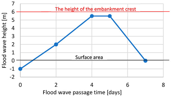 Considering the Polish regulations of the Minister of the Environment on the technical conditions to be met by hydrotechnical structures and their location [26], the stability of flood embankments that also serve as road embankments must have a stability coefficient greater than 1.5 (FoS > 1.5). In the case of the highest flood wave level, the stability coefficient must be greater than 1.3 (FoS > 1.3). In the FEM calculations, the highest level of the flood wave was assumed for the fifth day, in accordance with the hydrograph of water damming on a water slope (Figure 7).