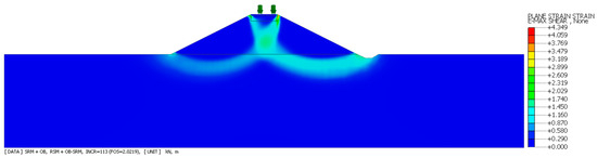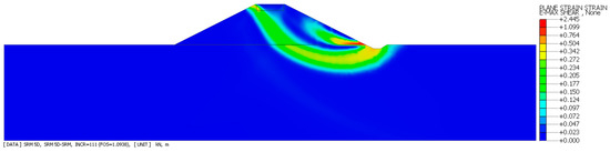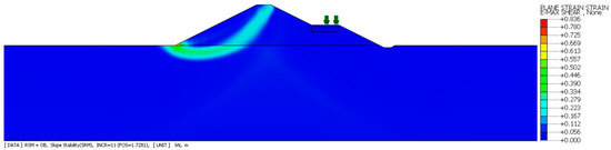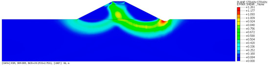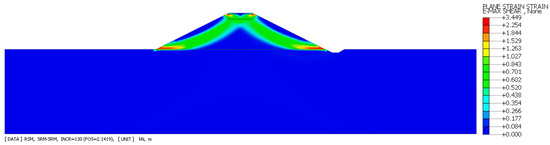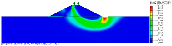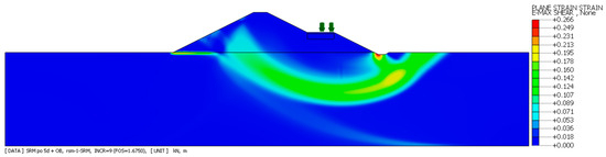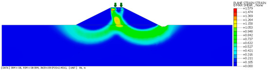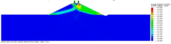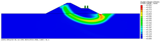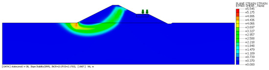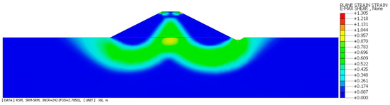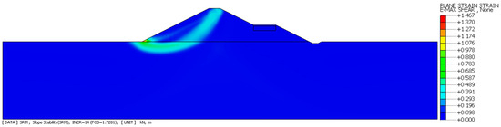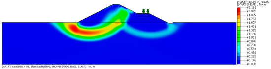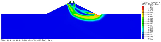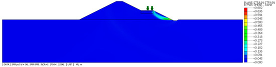 Figure 13. Maximum specific deformations–initial conditions of water damming on upstream slope, embankment body made of mining waste and with vehicle load (FoS = 1.72), variant 2.