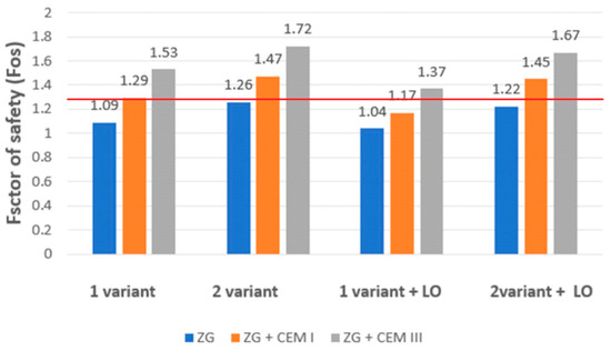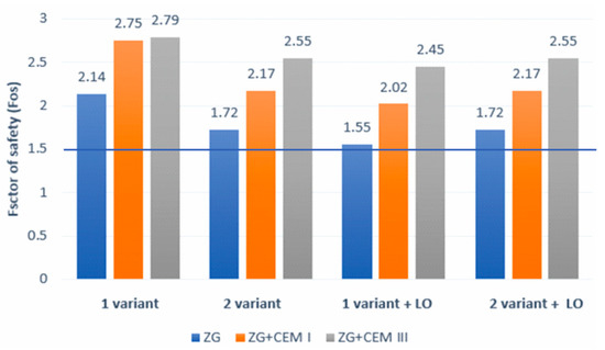 • Flood embankments made from mining waste with a binder in the form of the addition of 8% Portland cement (ZG + CEM I) in the second variant, where the road is on the side of the air slope additionally loaded with a vehicle (LO) (FoS = 1.45);
