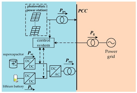 The configuration of an ESS in a photovoltaic power station can smooth the fluctuation of photovoltaic power, which supports the safe and stable operation of the electrical grid. Because the power-type ESS components and energy-type ESS components can complement each other in their use characteristics, the method of using a hybrid energy storage system (HESS) to cooperate with each other can make up for the shortcomings of a single ESS technology, thereby extending the life of ESS components and improving the economy of power system operation []. Lithium batteries can be used as a typical energy-type ESS due to their high energy density, high safety, and long charging and discharging duration. Supercapacitors offer high power density, long service life, and fast response speed, which can be used as a typical power-type ESS []. Therefore, lithium batteries and supercapacitors are selected to form an HESS in this paper.