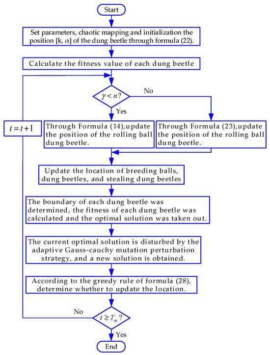 Inspired by the behaviors of the dung beetle (DB), which include ball rolling, dancing, foraging, breeding, and stealing, Xue J et al. [] presented the DBO algorithm in 2023. A colony of DBs is made up of rolling DBs, breeding DBs, stealing DBs and small DBs. The position of the rolling DB is updated throughout rolling. The rolling mathematical model can be represented as: