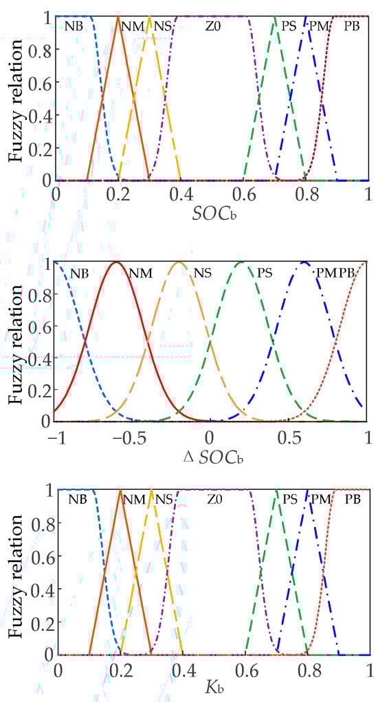 The fuzzy controller has two input variables and , and the output variable is . Combining expert experience to formulate fuzzy logic rules, when , the larger is, the smaller the output variable should be; when , the smaller is, the smaller the output variable should also be. For , {NB, NM, NS, ZO, PS, PM, PB} denote {very small, small, smaller, medium, large, big, very big}; for , {NB, NM, NS, PS, PM, PB} denote {negative-high, negative-medium, negative-low, positive-low, positive-medium, positive-high}; and for , {NB, NM, NS, ZO, PS, PM, PB} denote {very small, small, small, medium, large, big, very big}. After the fuzzy control optimization, the lithium battery receives a power command of . The fuzzy controller’s membership functions, the fuzzy control rule, and the fuzzy control surface diagram are as Figure 3, Table 1 and Figure 4.