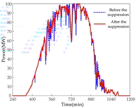 To confirm the efficacy of the proposed strategy, this paper uses the measured PV power data of a typical day of a 100 MW PV power plant in a certain place to carry out simulation analysis. The results after the adaptive model predictive control smoothing are displayed in Figure 5. Figure 6 displays the volatility of PV power fluctuations before and after the smoothing. As illustrated in the figure, the maximum volatility of raw PV power is 26.94%, which does not meet the requirements. After smoothing, the PV grid-connected volatility is basically controlled not to exceed 2%, with the maximum being 6.5%. Compared with the original volatility before smoothing, it is reduced by 20.44%, which complies with the PV grid-connected volatility regulations, and the smoothing effect is more prominent.