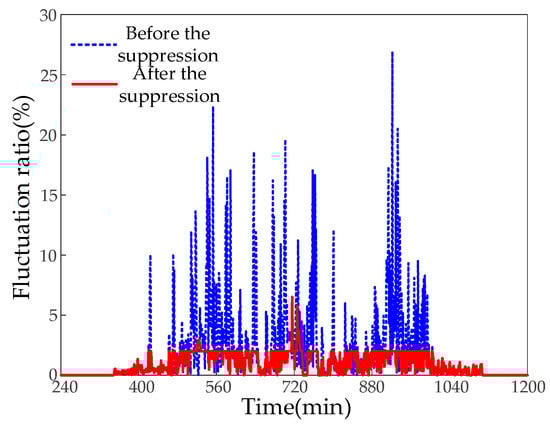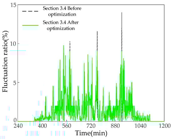 The grid-connected volatility before and after optimization by the mentioned anti-volatility overrun strategy is shown in Figure 16. It is evident that the grid-connected volatility before optimization has some overruns, reaching a maximum of 14%. After the optimization of the strategy proposed in Section 3.4, the grid-connected volatility does not overrun, with the highest point being 9.78%, and the requirement of not exceeding 10% is still consistently met. This proves that the proposed strategy can effectively prevent grid-connection volatility from crossing the limit.