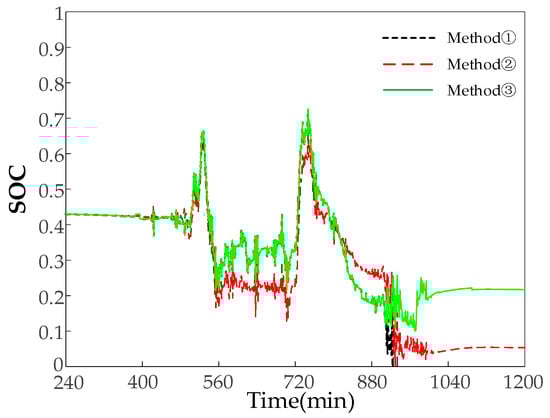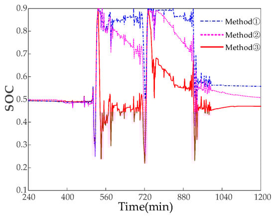 The supercapacitor in the three cases of ① taking no measures, ② optimizing with traditional fuzzy control, and ③ optimizing with the strategy proposed in Section 3.2 are compared, as shown in Figure 13. It can be seen that if no measures are taken, exceeds the limit at the 911 min mark and drops to 0 at the 923 min mark, losing the ability to participate in smoothing fluctuations. If traditional fuzzy control is used to optimize the supercapacitor , although the extreme case of dropping to 0 is avoided, due to the small capacity of the supercapacitor and the random output, is located in the exceeded interval in the middle of the day for as much as 527 min, accounting for 36.6%, and the expected effect cannot be achieved. If the optimization strategy proposed in this paper is adopted, has no overrun situation and is able to recover itself in a timely manner.