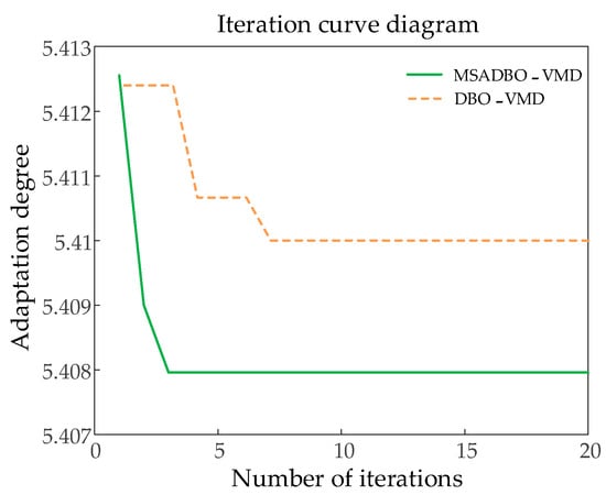 If parameters and of the VMD method are not chosen appropriately, they may cause over- or under-decomposition. In this paper, VMD is optimized by the MSADBO algorithm, and the fitness function is envelope entropy. Through iterative updating, constantly searching for the minimal value of the fitness function until the criteria for termination are met, the optimized values of and are obtained. The flow chart for optimization is shown in Figure 2.