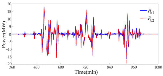 where and are the power commands of the two after adjustment, and is the set threshold, which can be selected according to the actual situation. In this paper, we take MW.