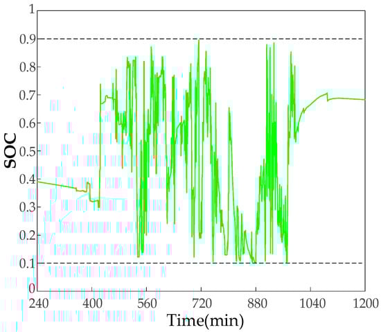 In order to fully verify the anti-overrun and self-recovery effects of the strategy proposed in Section 3.2 on , the capacity of the supercapacitor is significantly reduced to one-fifth of the original, and the optimized by the proposed strategy is displayed in Figure 14. It is evident that even in cases where the supercapacitor’s capacity is significantly decreased, the proposed strategy can still ensure that does not exceed the limit, and the supercapacitor has a self-recovery effect. At this time, the number of lithium battery charge/discharge conversions only increased by 7.8%, so the strategy will not significantly increase the number of lithium battery charge/discharge conversions.