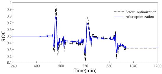After power optimization of the lithium battery by fuzzy control in Section 3.3, the of the lithium battery before and after optimization is shown in Figure 15. It is evident that after optimization by fuzzy control, the maximum value of decreased from 95.89% to 79.14%, and the minimum value increased from 13.08% to 24.36%. This shows that is always located in the normal interval after optimization, preventing the lithium battery from crossing the limit.