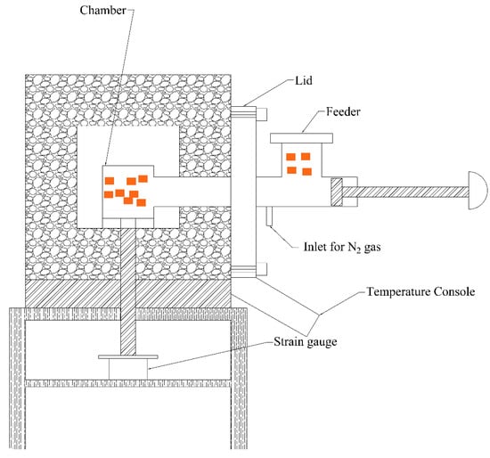 The pine waste was collected from Elisabeth Park, Godollo, Hungary. The coordinates of the area of collection of pine waste are 47.60 N and 19.33 E. The ultimate and proximate analyses were carried out at the Institute of Agricultural Engineering, National Agricultural and Innovation Centre, Godollo, Hungary. The net 9.11 kg of pine cone was collected and ground by a 1.49 kW rotor milling machine with a 6-disc rotor (Retsch SM 2000, Haan, Germany) to allow it to pass through a 1.5 mm sieve. The size of the hopper was 80 mm × 80 mm. The feeding rate of pine cones was in the range of 0.05–0.08 kg∙min−1. The measured bulk density of the pine cones was 295.60 kg∙m−3. The physical conversion efficiency of the pine cones was 53.34%. The average *energy consumption to mill the pine cones was 76.55 kW∙h/kg ($7.58/kg). For torrefaction purposes, around 10 g of powder-form pine cone (Pinus nigra) was thermally processed by improvising a programmable Joule heating system (Nabertherm Gmbh, Lilienthal, Germany). The drawing of the proposed torrefaction unit is shown in Figure 1. The *energy required for the thermal pre-treatment process was 7 kW∙h/kg ($ 0.53/kg). The energy consumption of the heating system and grinder was estimated using a multifunction analyzer (EMD, Contrel Electtronica, Lombardy, Italy).
