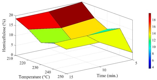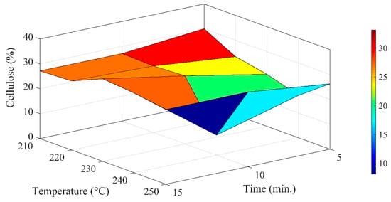 The composition of cellulose and hemicellulose after pre-treatment is graphically represented in Figure 2 and Figure 3. The standard uncertainty in the measurement of the cellulose fraction was in the range of ±1.33–2.57%, whereas it varied from ±1.53% to ±3.06%. The average % fractions of cellulose and hemicellulose with temperature at 5 min, 10 min, and 15 min were, respectively, 23.53%, 23.84% and 30%, and 12.41%, 12.83%, and 14.05%.
