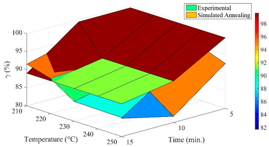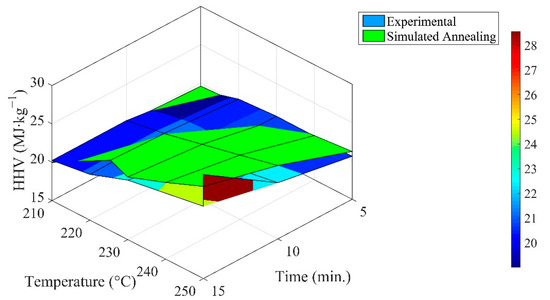 Detailed information on optimal solutions computed through SA is provided in Table 7. A common solution was obtained for the maximum solid yield derived after torrefaction. The optimal solid yield would be maximized at 250 °C with a duration of 5 min. The SA exhibits a thermal lag while performing optimization at a higher temperature range for a short duration, which was not exactly the case upon estimating the values of γ experimentally. The reason for the same is that the residence period of experimentally conducted torrefaction does not exactly comply with the algorithm of the annealing process. The global maximum solid yield estimated by SA was at operating conditions of 210 °C and 5 min.
