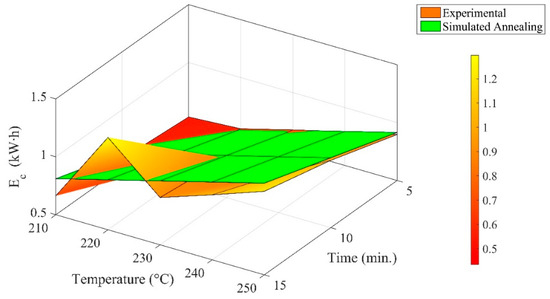- The deviation in the torrefaction temperature would impact the energy consumption of the torrefaction unit. However, no evidence of support was observed that the residence time might influence Ec. The solution beyond the experimental constraint provided 188.024 °C as a global minimum value of torrefaction temperature that is supposed to be conducted for 4 min only. Concomitantly, the global maximum estimated by SA was elevated by 5.73% as compared to the corresponding maximum derived experimentally.