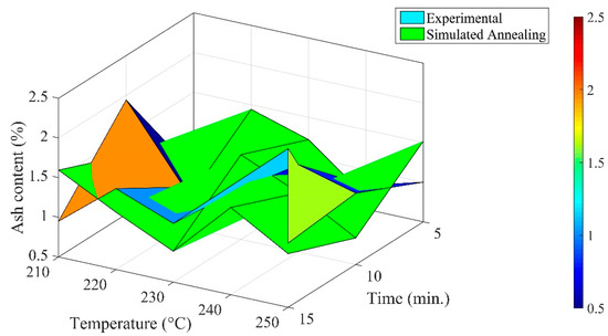 The solution computed through the SA algorithm is provided in Table 6. Conversely, the ash content at 220 °C (SA) rose by 0.56% while comparing with the global minimum noticed in the experimental dataset. The optimal value of ash content obtained at 340 °C for the residence time of 4 min was 0.110% (for constraints other than experimental). The global maximum solution (SA) within the experimental condition was 4.086% lower than the corresponding values calculated for the torrefied samples of pine cones. The global minimum within the experimental domain was observed at 210 °C for 5 min.
