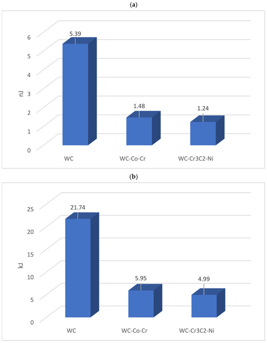 Moreover, based on the measurements of the sample mass before and after applying the coating, the mass of individual coatings was calculated, which allowed for the calculation of the total kinetic energy of the particles forming the coating (Figure 2b). In the case of a sintered carbide coating, much higher kinetic energy is observed, both for a single particle and for the energy necessary to produce the entire coating.
