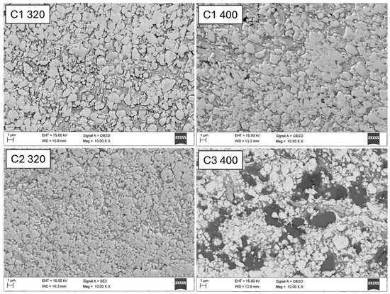 Analyzing the images obtained using a scanning microscope (Figure 3), it is clearly visible that the higher kinetic energy of the WC–Co coating particles (C1-320) compared to C1-400 resulted in the deposition of a larger number of carbides in the matrix. At the same time, lower porosity is observed, which is confirmed by the results of the microhardness measurement (Table 4). It should be emphasized that a larger number of hard carbides in the matrix results in a higher roughness parameter of the analyzed coating (Table 4).