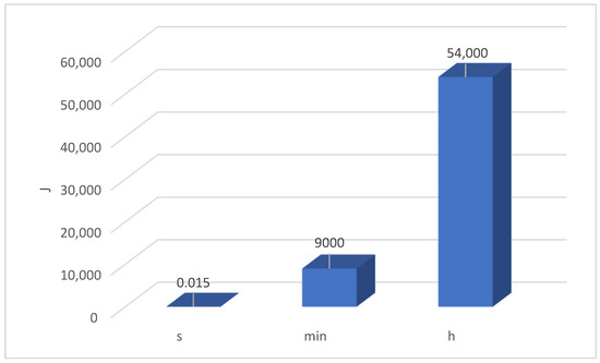 The kinetic energy of the erodent is 15 mJ acting on a unit of surface in one second, so during the test, the kinetic energy of corundum particles (9th degree of hardness on the Mohr scale—right after diamond) acts on the surface. Additionally, if the exposure to the erodent lasted for an hour, the kinetic energy of particles with a constant flow of only 2 g/min of corundum would already be 54 kJ (Figure 4).