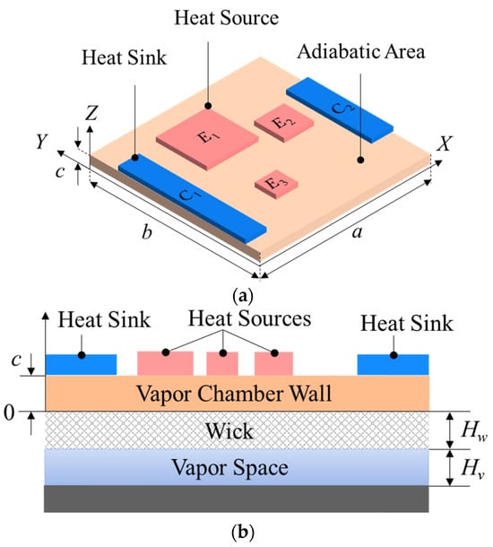 Many compact electric power-based devices consist of various components, each of which generates significant amounts of heat simultaneously. Particularly, the maximum temperature of electric power-based devices should be maintained at less than 80 °C to prevent the deterioration of electric devices’ performance [1,2]. In order to reduce the maximum temperature of power-based components, many researchers have made great efforts to efficiently spread heat by using high-thermal conductivity materials such as copper sheets and graphite sheets in narrow spaces of less than 1~2 mm [3,4,5,6]. However, the thickness of heat spreaders using copper or graphite sheets near 1 mm presents challenges in efficient heat dissipation. So, many researchers have focused on thin flat heat spreaders or thin vapor chambers (TVCs) to address the challenges, highlighting their advantages, including high thermal conductivity (over 10,000 W/m·K), lightness, reliability, and a relatively long lifespan. For example, Li et al. [7] investigated the effect of the superhydrophilicity of a screen mesh wick on the capillary force of a thin flat heat spreader with 0.5 mm thickness. They presented the effective thermal conductivity of the heat spreader which can be applied to a simplified specific system. Moreover, Huang et al. [8] optimized the total size, the wick thickness, and the height of the vapor core to maximize the heat transfer rate of TVCs with a screen mesh wick. Li et al. [9] suggested the optimized number and width of radially grooved channels. Ranjan et al. [10] numerically optimized the wick in a 3 mm thick flat vapor chamber designed for use at high heat fluxes exceeding 50 W/cm2. The wick utilized a screen mesh wick with a thickness of less than 0.5 mm, and the thermal resistance and pressure drop were predicted based on the wick thickness. Li et al. [11] theoretically and experimentally studied the performance of a flat vapor chamber with support columns. Specifically, they theoretically predicted and experimentally validated the pressure distribution and temperature distribution according to wick thickness and the vapor core. Additionally, using the theoretical model, they presented the pressure loss with and without support columns and its impact on heat transfer performance. However, they [7,8,9,10,11] only considered a vapor chamber or a thin flat heat spreader with a single heat source and sink, despite the need for analyzing a thin vapor chamber capable of uniformly distributing heat from multiple heat sources. So, Lefevre and Lallemand [12] proposed thermodynamic and hydrodynamic models to theoretically predict the performance of flat micro heat spreaders with multiple heat sources and sinks in steady-state conditions. Recently, Subedi et al. [13] optimized the geometry of screen mesh wicks in TVCs considering the Brinkman effect in the screen wick. However, both analytical models [12,13] have a significant limitation. They assumed that the heat flux of all heat sources remains constant and of the same magnitude, even though the size of the heat source can be adjusted in various ways. Particularly, to the best of the authors’ knowledge, there are no comparative results available to predict which type of wick (screen mesh, grooved, or sintered wicks) can produce the maximum heat transfer rate in TVCs with multiple heat sources and sinks.