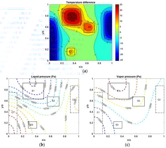 Validation results (Q = 76.6 W, Tsat = 50 °C). (a) Temperature difference, (b) the liquid pressure distribution of a TVC wall, (c) vapor pressure distribution.