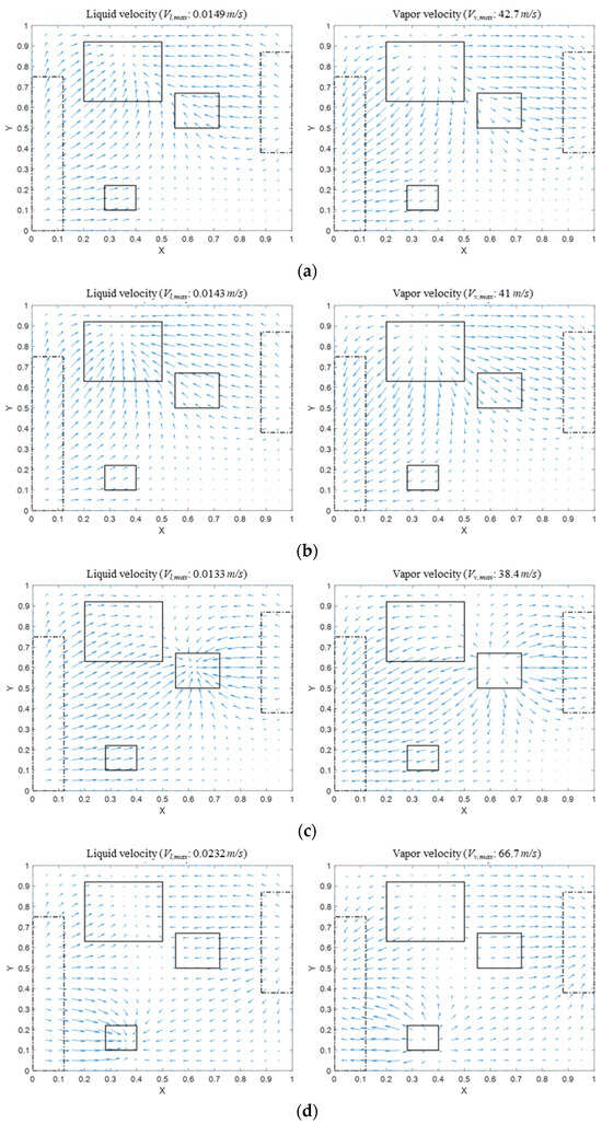 Velocity distribution in TVCs with screen mesh wick according to heat flux ratio of heat sources (d = 15 μm, w = 170 μm, Hw = 30 μm, Q = Qmax). (a) :: = 1/3:1/3:1/3, (b) :: = 8/10:1/10:1/10, (c) :: = 1/10:8/10:1/10, (d) :: = 1/10:1/10:8/10.