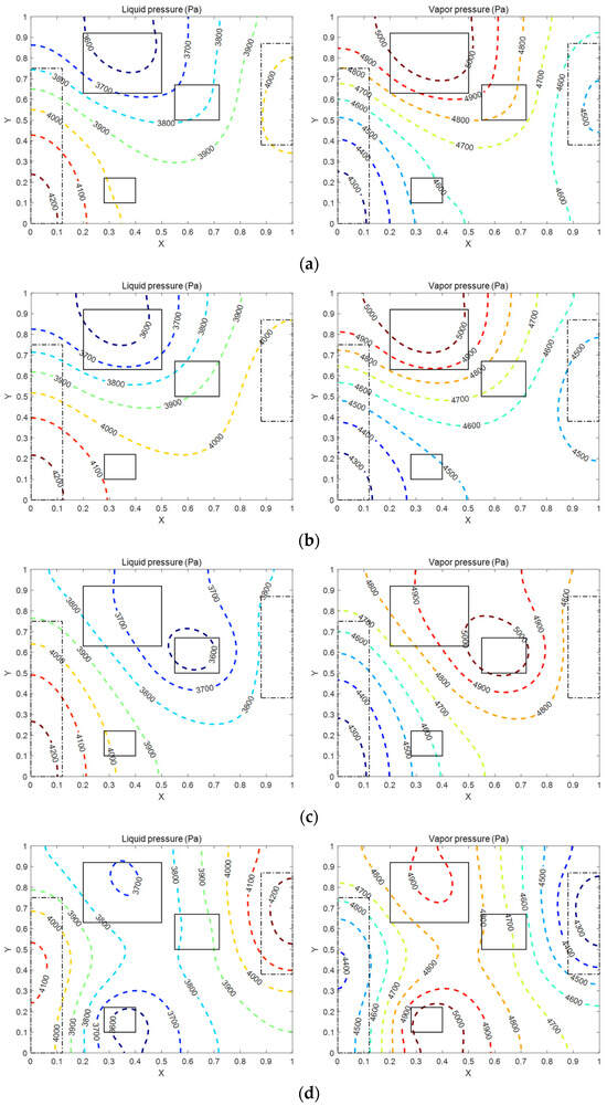 Pressure distribution in TVCs with screen mesh wick according to heat flux ratio of heat sources. (d =15 μm, w = 170 μm, Hw = 30 μm, Q = Qmax) (a) :: = 1/3:1/3:1/3, (b) :: = 8/10:1/10:1/10, (c) :: = 1/10:8/10:1/10, (d) :: = 1/10:1/10:8/10.