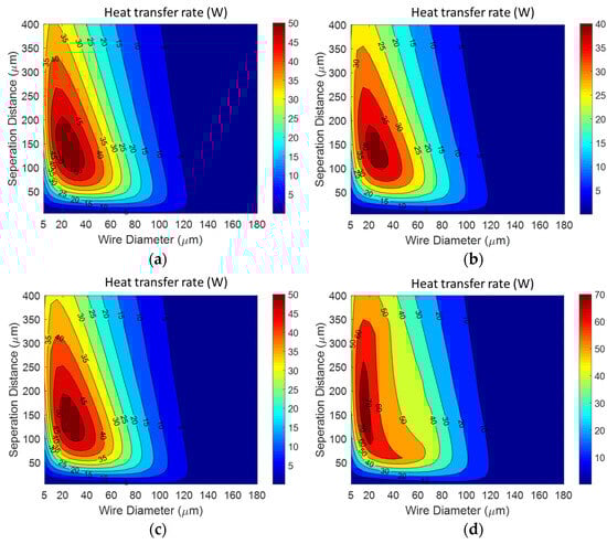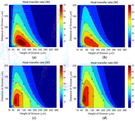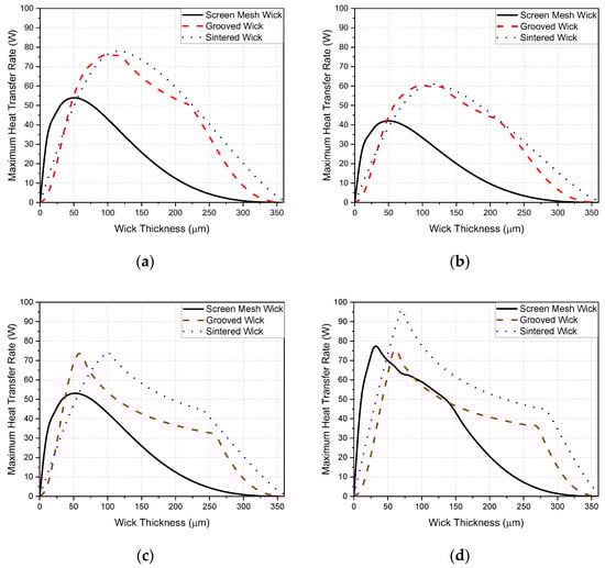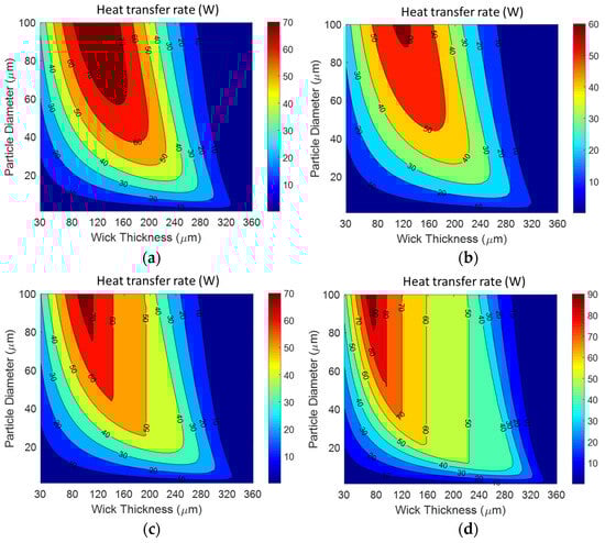 Three types of wicks are optimized to maximize the heat transfer rate using engineering key parameters. The optimization results for the screen mesh wick, grooved wick, and sintered wick under various heat flux conditions are shown in Figure 7, Figure 8 and Figure 9. Figure 7 shows the TVC with a screen mesh wick, characterized by a wire diameter and wire separation distance ranging from 20 to 40 μm and 100 to 200 μm, respectively, which can achieve the maximum heat transfer rate regardless of heat flux conditions. Also, Figure 8 presents the effects of the height and the distance of the groove on the heat transfer rate of the TVC with a grooved wick. The TVC exhibits the maximum heat transfer rates at a distance of the groove ranging from 30 to 50 μm and height ranging from 60 to 100 μm. Particularly, vertical contour lines as shown in Figure 8 appear when the maximum heat transfer rate is determined by the allowable maximum temperature constraint. Moreover, Figure 9 shows the effects of the particle diameter and wick thickness on the heat transfer rate when the sintered wick is used in a TVC. In the present study, the optimization was theoretically conducted by restricting the sintering particles to below 100 μm for a thin vapor chamber with a thickness of less than 1 mm. So, as shown in Figure 9, the maximum heat transfer rate for the sintered wick is observed when the particle diameter is in the range of 80~100 μm and the wick thickness is within 60~120 μm. As a result, it is shown that TVCs exhibit the maximum heat transfer rates in specific regions of engineering key parameters, irrespective of the distribution of heat flux.